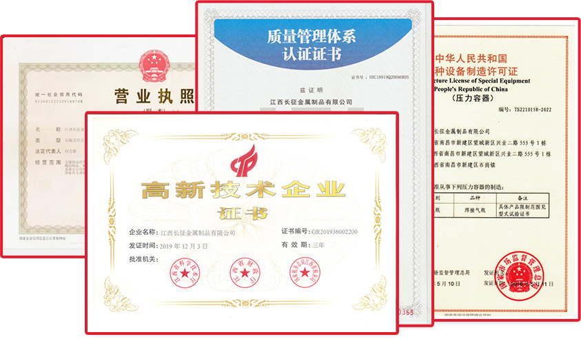 江西長征金屬制品有限公司,原大型航天軍工企業(yè)江西長征機器廠,是國家勞動部定點生產(chǎn)氣瓶的專業(yè)廠家。公司擁有雄厚的軍工技術(shù)力量,設(shè)備先進,檢測手段完備,按照GB/T5100標準和GB/T5842標準、GB/T17673標準要求,建立了嚴格的企業(yè)管理制度和完整有效的產(chǎn)品質(zhì)量保證體系。